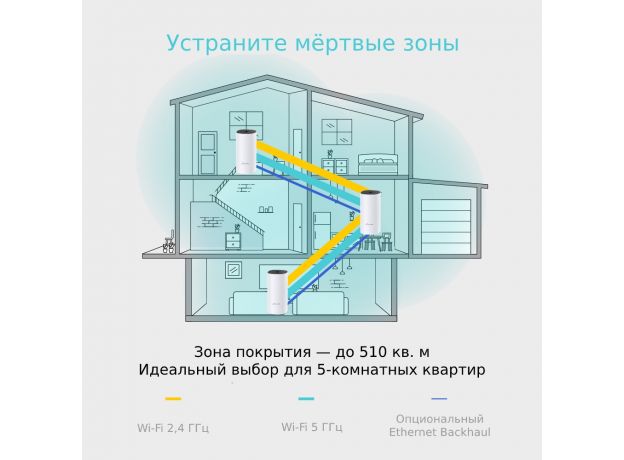 | Покрытие Wi-Fi | Для пятикомнатных квартирТехнология TP-Link Mesh Благодаря этой технологии устройства Deco будут работать вместе, обеспечивая бесшовное покрытие 2 встроенные антенны Из нескольких антенн формируется мощный сигнал, увеличивающий радиус действия Beamforming Концентрирует беспроводной сигнал в направлении клиентов для расширения радиуса действия Wi-Fi |