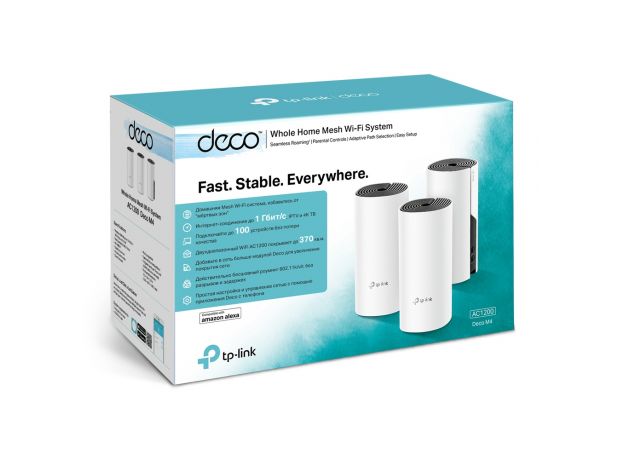 - Комплект Deco M4 с двумя устройствами обеспечивает покрытие до 260 кв.м. Если этого недостаточно – просто добавьте в сеть больше модулей Deco для увеличения покрытия (также возможен комплект из трёх модулей).