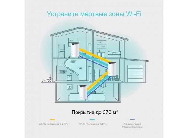 | Покрытие Wi-Fi | Для пятикомнатных квартирТехнология TP-Link Mesh Благодаря этой технологии устройства Deco будут работать вместе, обеспечивая бесшовное покрытие 2 встроенные антенны Из нескольких антенн формируется мощный сигнал, увеличивающий радиус действия Beamforming Концентрирует беспроводной сигнал в направлении клиентов для расширения радиуса действия Wi-Fi |