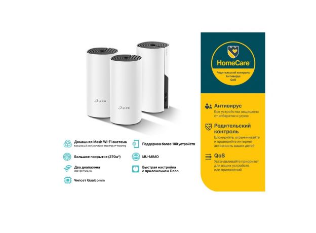 | Покрытие Wi-Fi | Для четырёхкомнатных квартирТехнология TP-Link Mesh Благодаря этой технологии устройства Deco будут работать вместе, обеспечивая бесшовное покрытие 2 встроенные антенны Из нескольких антенн формируется мощный сигнал, увеличивающий радиус действия Beamforming Концентрирует беспроводной сигнал в направлении клиентов для расширения радиуса действия Wi-Fi |