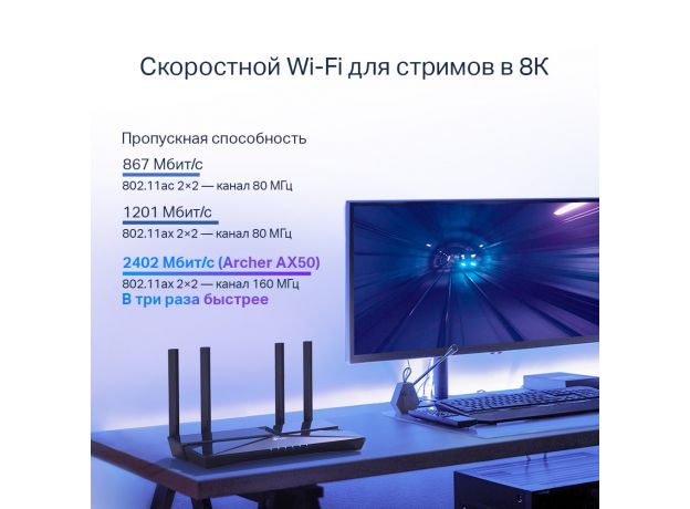 Нет смысла откладывать покупку роутера с Wi‑Fi 6, ведь воспользоваться преимуществами его высокой скорости можно уже сегодня. Благодаря ширине канала в 160 МГц и модуляции 1024‑QAM скорость Archer AX50 может достигать 3 Гбит/с. Наслаждайтесь потоковыми видео и онлайн‑играми как никогда прежде — встроенный мощный двухъядерный чипсет обеспечит одновременную плавную работу нескольких требовательных задач‡.