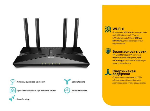 - Улучшенная безопасность — более защищённый Wi-Fi и доступ в интернет благодаря пакету TP-Link HomeCare™.
