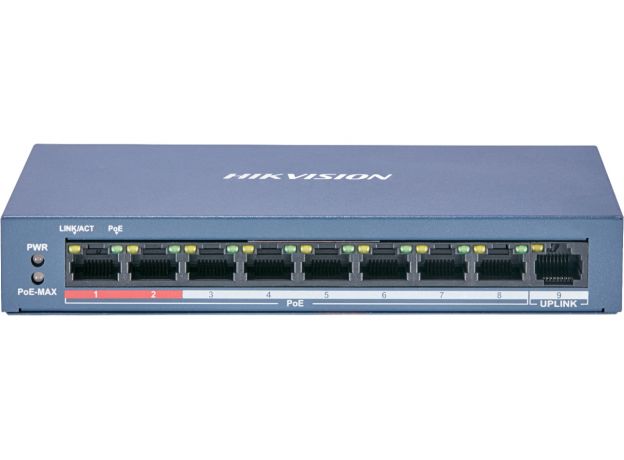 PoE-коммутатор Hikvision DS-3E0109P-E/M – 8-портовый неуправляемый коммутатор с одним uplink-портом 100 Mbps для восходящих соединений. 1-8 порты поддерживают питание устройств и передачу данных по стандарту PoE+/ PoE через обычную витую пару. Суммарный бюджет мощности питаемых устройств может составлять 60 Вт (до 30 Вт на порт).