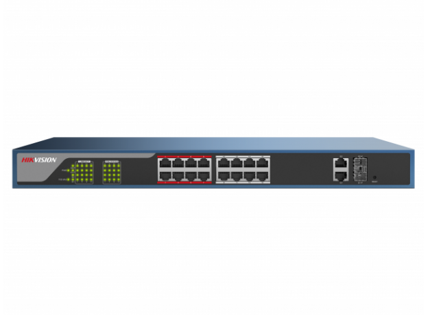 Управляемый PoE-коммутатор (Web-интерфейс) Hikvision DS-3E1318P-E снабжен 16 разъемами RJ-45 100M PoE для подключения устройств с возможностью передачи питания к ним по сети Ethernet, а также двумя Uplink комбо-портами 1000М. Поддерживаются стандарты PoE: IEEE802.3af (до 15.4 Вт) и IEEE802.3at (до 30 Вт). Бюджет PoE составляет 230 Вт. Питание AC100-240В. Пропускная способность 7.2Гб/с.