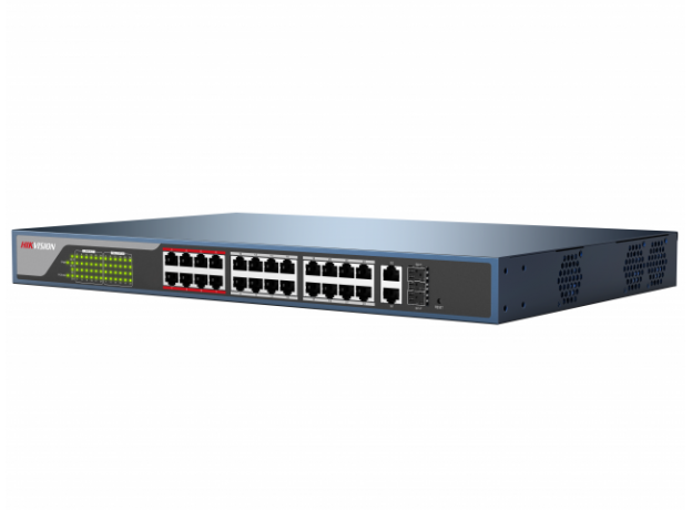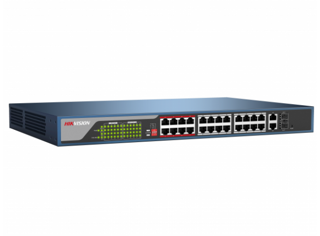 Управляемый PoE-коммутатор (Web-интерфейс) Hikvision DS-3E1326P-E снабжен 24 разъемами RJ-45 100M PoE для подключения устройств с возможностью передачи питания к ним по сети Ethernet, а также двумя Uplink комбо-портами 1000М. Поддерживаются стандарты PoE: IEEE802.3af (до 15.4 Вт) и IEEE802.3at (до 30 Вт). Бюджет PoE составляет 370 Вт. Питание AC100-240В. Пропускная способность 8.8Гб/с.