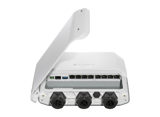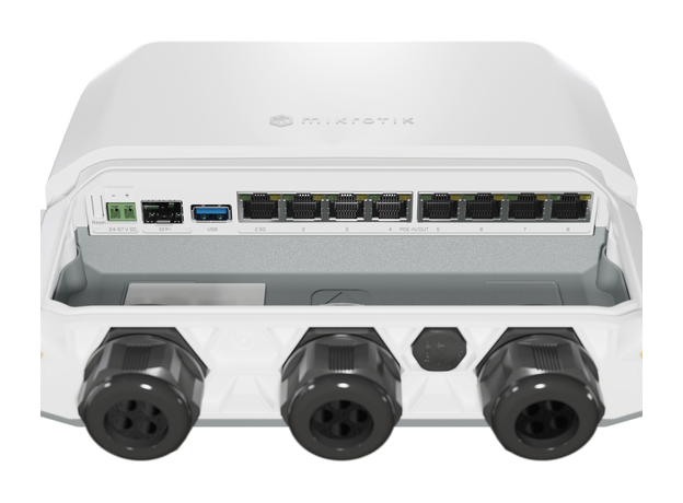 RB5009UPr+S+OUT — высокопроизводительный уличный маршрутизатор MikroTik в погодоустойчивом корпусе со степенью защиты от пыли и влаги IP-66, имеющий 7 Ethernet-портов 1 Гбит/с, 1 Ethernet-порт 2.5 Гбит/с, 1 порт SFP+ и полноразмерный USB порт (3.0 тип A). Устройство оснащено мощным 4-ядерным процессором 88F7040 с частотой 1400 МГц, а питание может осуществляться 9-ю различными способами: на передней панели есть 2-контактный разъем питания, а также вход и выход PoE на всех 8-ми портах Ethernet. Маршрутизатор может использовать любой из этих источников для питания себя, выбирая источник с самым высоким напряжением, когда доступно несколько источников. Маршрутизатор поддерживает PoE out, который определяется максимальным входящим напряжением питания самого устройства. Доступны варианты PoE стандарта 802.3af/at или Passive PoE 24 В.