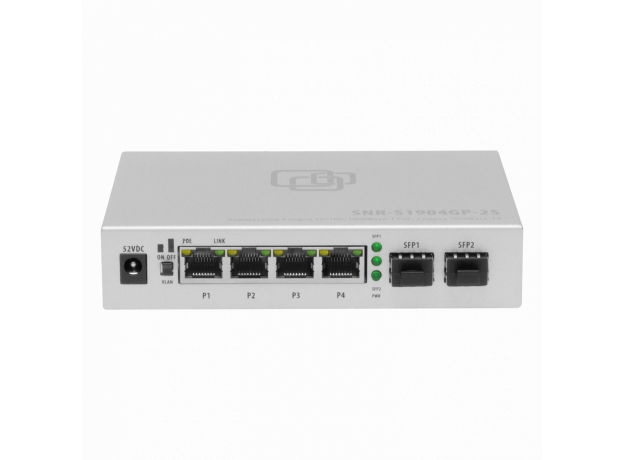 SNR-S1904GP-2S имеет 4 порта 10/100/1000Base-T c PoE 802.3af/at и с суммарной мощностью PoE 65 Ватт для подключения абонентских линий и 2 порта 1000Base-X (SFP) для подключения к волоконно-оптической сети. Поддержка POE 802.3at/af на всех 4 портах позволяет питать IP/видео-телефоны, Wi-Fi-точки, тонкие клиенты напрямую от коммутатора, что уменьшает стоимость владения и упрощает обслуживание инфраструктуры.