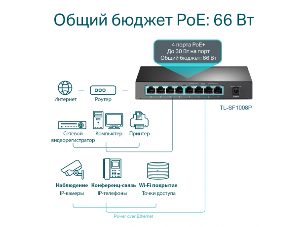 Благодаря соответствию стандарту PoE+ 802.3af/at каждый порт PoE поддерживает до 30 Вт. Общий бюджет PoE в объёме 66 Вт и четыре PoE‑порта открывают широкий ряд возможностей, позволяя использовать коммутатор для видеонаблюдения в офисе, общежитиях и малом бизнесе. TL-SF1008P совместим с любыми IP‑камерами, точками доступа, IP‑телефонами, компьютерами, принтерами и другими устройствами.
