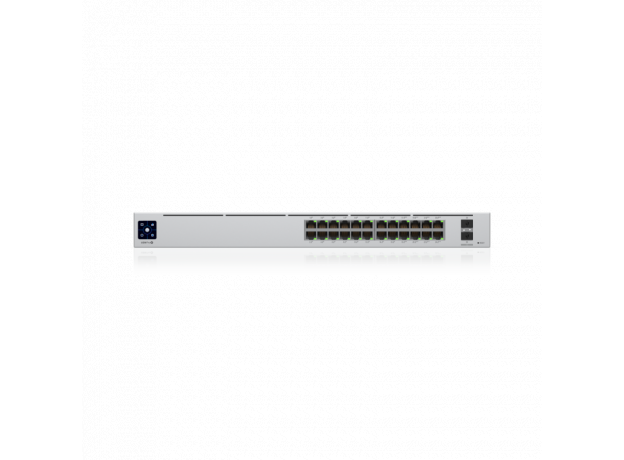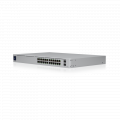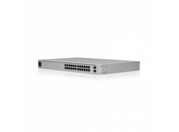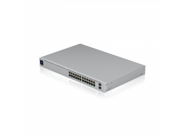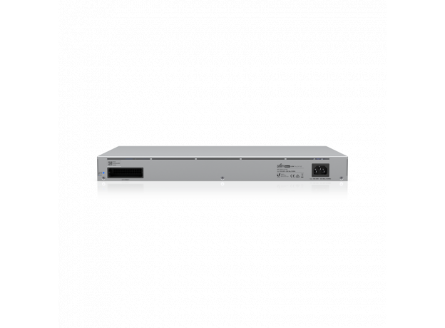 Смешанный сетевой интерфейс UniFi Switch Pro 24 PoE включает в себя как 24 порта GigabitEthernet, так и 2 слота под модули SFP+. Говоря про разъемы RJ45, стоит отметить, что все они способны раздавать питание по витой паре: 16 портов работают по стандарту PoE+, а оставшиеся 8 – по новому стандарту 802.3bt, который уже используется в некоторых устройствах Ubiquiti. Тем не менее при проектировании сети следует учитывать, что максимальная мощность на интерфейсах оставляет 30 и 60 ватт соответственно – этого вполне достаточно для обеспечения питания устройствам Ubiquiti.