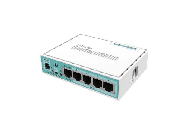hEX– SOHO-маршрутизатор MikroTik для небольших офисов, оснащённый 5-ю Ethernet-портами 1 Гбит/с, мощным двух ядерным процессором с тактовой частотой 880 МГц, 256 МБ оперативной памяти, портом USB, а также слотом для карт памяти microSD. Ethernet-порт №1 может использоваться для получения питания устройства посредством Power over Ethernet стандартаPassive PoE 8—30 В от другого оборудования. Устройство поддерживает аппаратное IPsec шифрование данных (~470 Мбит/с), а также возможность установки пакета 'MikroTik The Dude'.