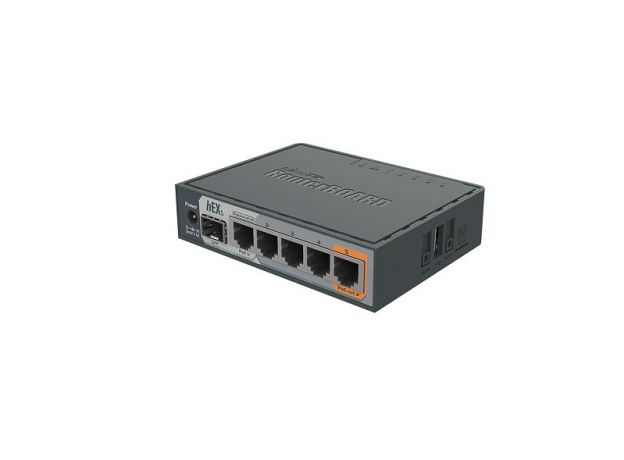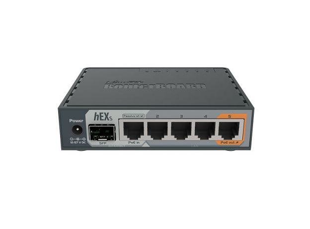 hEX S – продвинутый маршрутизатор Mikrotik для небольших офисов, оснащённый 5-ю Ethernet-портами 1 Гбит/с, 1-им портом SFP (1.25 Гбит) для оптических соединений, мощным двух ядерным процессором с тактовой частотой 880 МГц, 256 МБ оперативной памяти, портом USB, а также слотом для карт памяти microSD. Ethernet-порт №1 может использоваться для получения питания устройства посредством Power over Ethernet стандартов Passive PoE / 802.3af/at (PoE+) 12—57 В от другого оборудования; Ethernet-порт №5 может использоваться для подачи питания для других устройств посредством Power over Ethernet стандарта Passive PoE до 57 В! Устройство поддерживает аппаратное IPsec шифрование данных (~470 Мбит/с), а также возможность установки пакета 'MikroTik The Dude'.