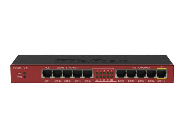 RB2011iL-IN — бюджетный настольный многопортовый маршрутизатор MikroTik, оснащённый сенсорным дисплеем и процессором AR9344 с архитектурой MIPS-BE. Устройство оснащёно 10-ю Ethernet-портами на двух независимых коммутационных группах: 5-ю 1 Гбит [gigabit ethernet] и 5-ю 10/100 Мбит [fast ethernet], последний оснащён поддержкой питания подключённых устройств посредством PoE out стандарта Passive PoE 8—30 В (Порт №10); максимальная сила тока на порт = 500 мА. Питание маршрутизатора осуществляется либо посредством входящего в комплект блока питания 24 В, 1.2 A, либо посредством PoE in стандарта Passive PoE 8—30 В (Порт №1).
