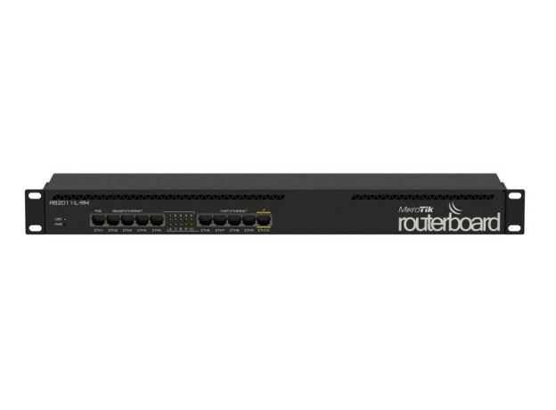 RB2011iL-RM — бюджетный многопортовый маршрутизатор MikroTik, оснащённый процессором AR9344 с архитектурой MIPS-BE. Устройство оснащёно 10-ю Ethernet-портами на двух независимых коммутационных группах: 5-ю 1 Гбит [gigabit ethernet] и 5-ю 10/100 Мбит [fast ethernet], последний оснащён поддержкой питания подключённых устройств посредством PoE out стандарта Passive PoE 8—30 В (Порт №10); максимальная сила тока на порт = 500 мА. Питание маршрутизатора осуществляется либо посредством входящего в комплект блока питания 24 В, 1.2 A, либо посредством PoE in стандарта Passive PoE 8—30 В (Порт №1).