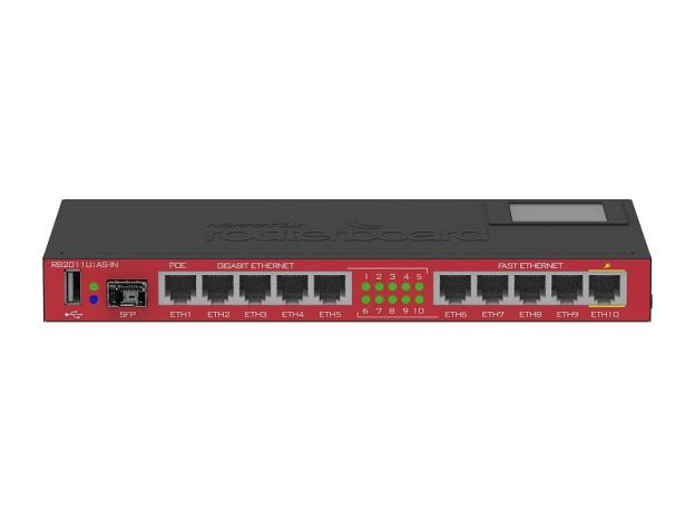 RB2011UiAS-IN — бюджетный настольный многопортовый маршрутизатор MikroTik, оснащённый сенсорным дисплеем и процессором AR9344 с архитектурой MIPS-BE. Устройство оснащено 10-ю Ethernet-портами на двух независимых коммутационных группах: 5-ю 1 Гбит [gigabit ethernet] и 5-ю 10/100 Мбит [fast ethernet], последний оснащён поддержкой питания подключённых устройств посредством PoE out стандарта Passive PoE 8—30 В (Порт №10); максимальная сила тока на порт = 500 мА. Также маршрутизатор имеет 1 порт SFP с поддержкой цифровой диагностики SFP DDMI, порт micro USB, а также консольный порт RJ45. Питание маршрутизатора осуществляется либо посредством входящего в комплект блока питания 24 В, 1.2 A, либо посредством PoE in стандарта Passive PoE 8—30 В (Порт №1). Рекомендуемые в использовании SFP-модули: S-85DLC05D, S-31DLC20D и S-35/53LC20D (приобретаются отдельно).