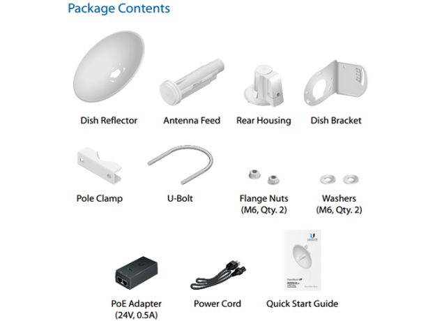 Комплект поставки включает радиомодуль, параболический отражатель, блок питания PoE, крепление для установки на мачту, позволяющее отрегулировать угол наклона антенны.