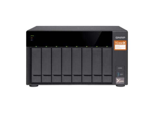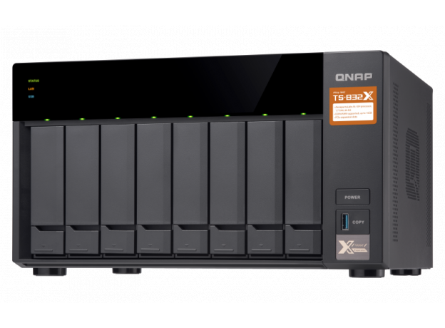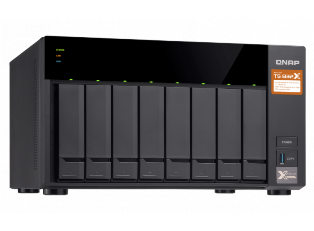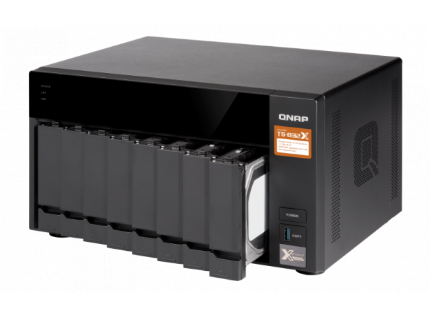 Новый экономичный NAS TS-832X выполнен на базе четырехядерного 64-битного процессора ARM Cortex-A57, работающего с оперативной памятью DDR4. Общее повышение производительности системы позволило добавить поддержку сетевых интерфейсов 10 Гбит/с SFP+ и слотов PCIe для расширения функционала устройства. Полная поддержка авто-тиринга Qtier, а также возможность реализации дополнительных уровней кэширования на M.2 SSD за счет установки карт расширения QM2 позволяют добиться высокой производительности устройства при операциях чтения/записи по сети.