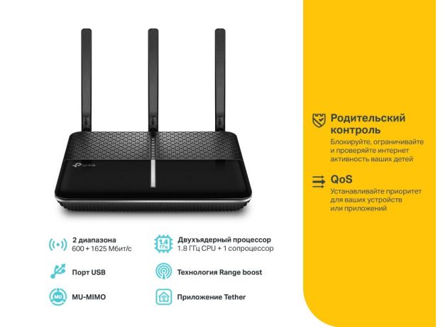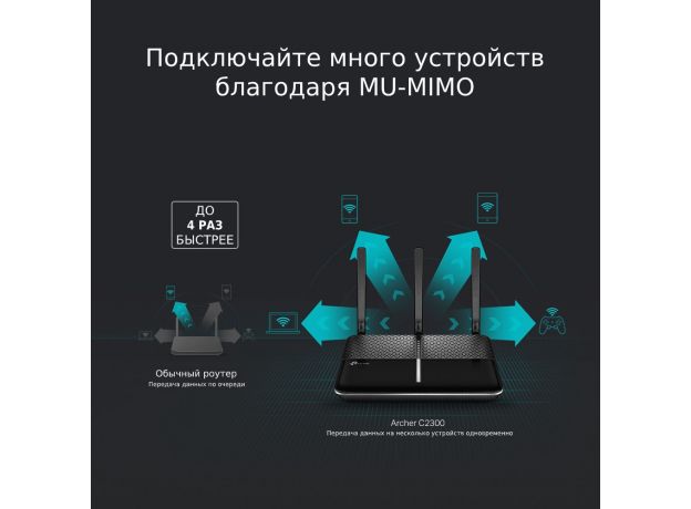 Archer C2300 — это сверхбыстрый двухдиапазонный Wi-Fi роутер со скоростью до 1733 Мбит/с на частоте 5 ГГц и до 600 Мбит/с на частоте 2,4 ГГц. Исключительная производительность Wi-Fi позволит играть в онлайн‑игры и вести HD-трансляции, а также делиться большими файлами с несколькими устройствами одновременно — и всё это по отличной цене.
