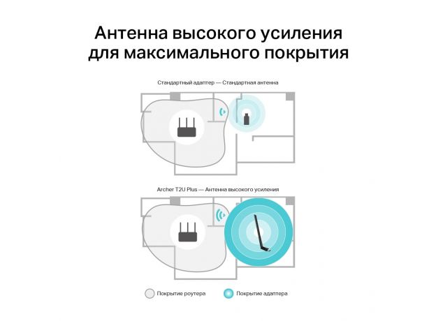 Archer T2U Plus оснащён 5 дБи антенной высокого усиления для максимальной скорости приема и передачи сигнала. Используйте стабильный и надёжный Wi-Fi по всему дому.