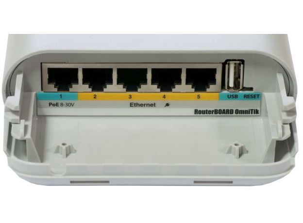 OmniTIK 5 PoE — точка доступа MikroTik в погодоустойчивом корпусе со всенаправленными антеннами двойной поляризации. Рекомендуется совместное использование устройства с оборудованием серии SXT, а также с любыми другими устройствами, поддерживающими стандарты 802.11. Устройство имеет 5 LAN-портов 10/100 Мбит/с (Fast Ethernet), поддержку получения питания посредством PoE стандарта Passive PoE 11—30 В (порт №1), возможность электропитания подключенных устройств с помощью PoE out (порты №№2-5), встроенный радиомодуль 5150–5875 МГц MIMO 2x2 (стандарт 802.11a/n), а также USB-порт, который даёт возможность подключения 3G-модемов или дополнительных модулей памяти. Точка доступа поддерживает технологию Nv2 TDMA с пропускной способностью до 200 Мбит.
