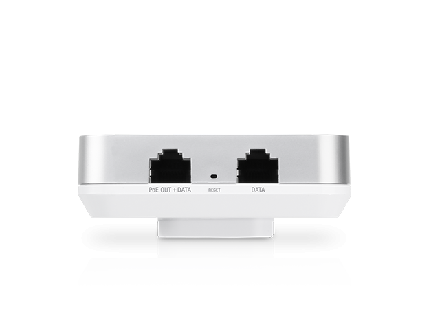 Устройство имеет 3 Ethernet-порта 1 Гбит: один на задней стороне для прихода питания (PoE+) и проводной сети, и два на нижней стороне для проводного подключения других устройств, при этом на порту №1 имеется поддержка питания PoE-out стандарта 802.3af*. Питание самого UniFi AP AC IN-WALL может осуществляться только от коммутатора из серий UniFi® Switch и EdgeSwitch™, а также сторонних производителей, имеющих поддержку PoE-питания 802.3af/at (PoE+). При получении питания стандарта 802.3af, выходной мощности UniFi AP AC IN-WALL может не хватить для питания подключенных устройств. Выходная мощность радиомодуля составляет 20 dBm (зависит от страны использования).